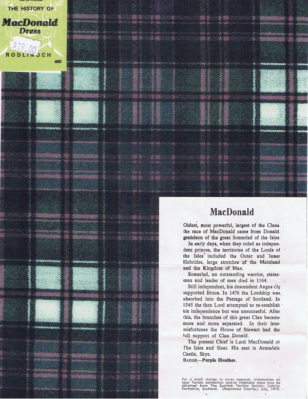 Another description of the MacDonald Clan and the MacDonald Dress tartan can be found attached to shawls and scarfs made of 100% pure new wool and made in Scotland. These can be purchased at Scottish shops in the United States of America or purchased in Scotland.